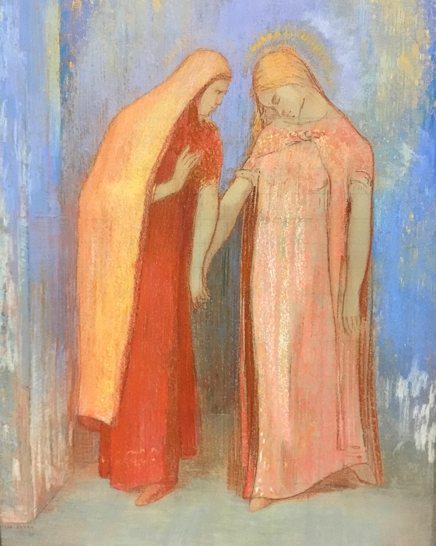 2 Dec. Art Advent #1. One of the most famous scenes in Christian art is that of the Annunciation, whenArchangel Gabriel appears to Mary with the news that she will be pregnant with Jesus. However, during this apparition Gabriel also shares the news that Mary’s cousin Elizabeth is pregnant as well. After receiving this news, Mary decides to visit Elizabeth and stays with her for several months. This visit is thought to have provided Elizabeth’s child with divine blessing, who would later be known as John The Baptist, Jesus’ cousin. French artist Odilon Redon captured Mary’s visit to Elizabeth in delicate pastel colors. He often painted dream-like scenes, with strange figures in imaginary realms, without a clear message or story. While the story that inspired The Visit is known, Redon primarily conveys the tenderness between the two women, as they each carry a heavy-weighing responsibility for the future of mankind.