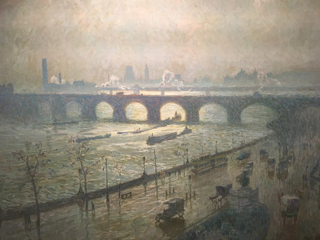 3 Dec. ART ADVENT #3 This view on the Waterloo Bridge documents the urban landscape of London in the early twentieth century. With an important place for the river Thames, boats on the water, horse carriages and trams on the streets. It is painted by one of the primary Impressionists of Belgium, Emile Claus. He got interested in this painting style after seeing the work of Claude Monet in the1890s. During World War I, Claus painted several London bridges while he was on exile in the city. These paintings capture how changing weather (light!) conditions changed the face of the city. || Emile Claus, Waterloo Bridge, Sun and Rain. March. ca.1916. Seen at Fin de Siecle Museum, Brussels.