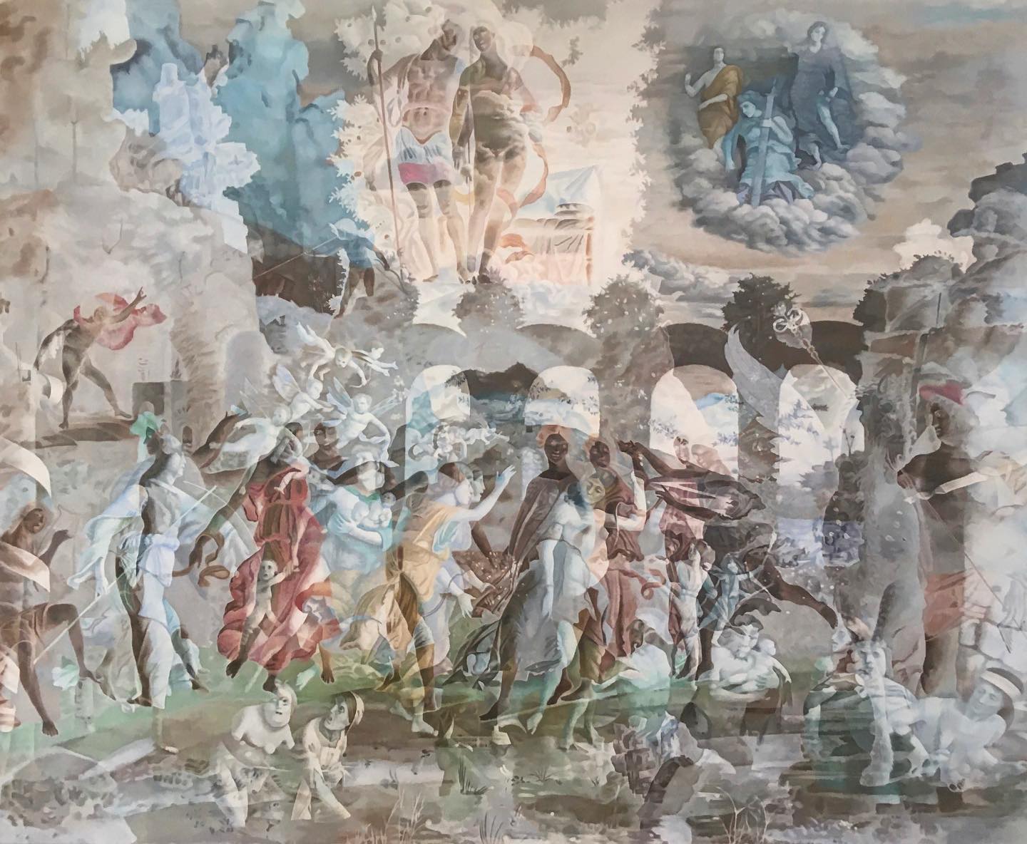 Today another artwork that directly engages with art history. In this painting, artist Zheng Guogu combined the depictions of two paintings by Andrea Mantegna: The Parnassus (1497) and Triumph of Virtue (1502). Both paintings are now in the collection of the Louvre, but were originally painted for the private studiolo of Isabella d’Este in the early sixteenth century. Zheng Guogu placed the two compositions, partly in negative on top of one another. Together with the color scheme, it results in a marvellously dynamic image. For the viewer it is hard to focus, the eye keeps being drawn to yet another part of the painting. Mantegna’s painting symbolize historical foundations of contemporary western Europe, in which rapid changes and transformations take place – symbolized by the dynamic viewing experience offered by the resulting painting.