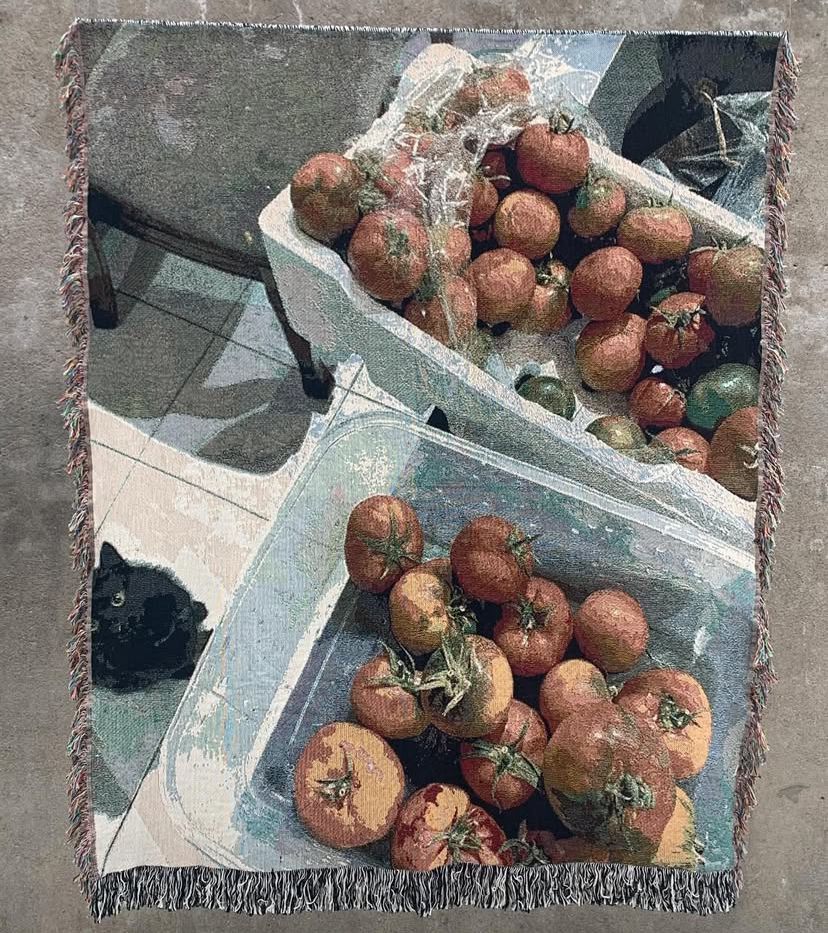 One thing I like about art is that I learn so many new things from it. This tapestry for instance, taught me about a very particular tomato – and how its existence, like so many foods and peoples, is currently under threat. Here you see the Ramisi tomato, which only grows in Qatif, the Saoudi city where artist Sara Abu Abdallah grew up. It only grows there due to the unique combination of elements in the soil. However, this produce is threathened, because of climate change, oil drillings, and urbanization. As a consequence many farms disappear from the area, profoundly impacting the tomato production. In dozens of tapestry works, Abu Abdallah has monumentalized the Ramisi tomato. They form a memory of a home that is rapidly and irreparably changing.